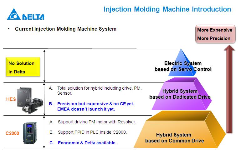 Injection Molding machines is a quite common application, because of that, Delta develop several solution depending on the different type of injection moldign machine.