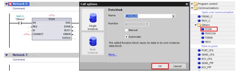 3- In “Instructions” -> “Extended instructions” -> “Communications” -> “Open user communication”, open the “Others” folder and drag the “TCON” block to the operation block. This automatically generates an instance data block for the “TCON” function that you have to confirm with “OK”