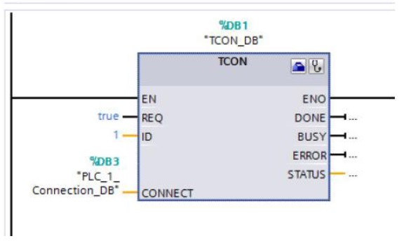 1- Inside the PLC program, the “TCON” system function block (SFB) has to be inserted in order to establish the communication with Delta HMI