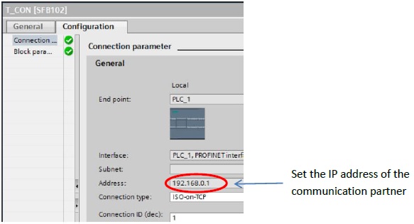 5- Inside the properties of the TCON block specify the IP address of the communication partner