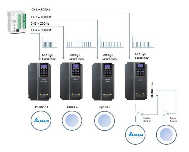 The usage of pulses for setting controls and signal blocks is widely used in PLCs, for a wide range of tasks. Even though, most frequency converters do not count on this resource to receive setpoint from PLCs, this is usually done through analog inputs/outputs or Fieldbus. Delta C2000 has a fast signal receiving digital input, called MI8 high speed input, through this digital input C2000 can receive a setpoint: speed or position. Another advantage is that PLCs usually have few analog outputs built-in, which can be expanded by AI/AO cards. However, with Delta DVP28SV you can assign until 4 channels in order to control external devices such as Delta C2000 drives, through its internal PLCs to set speed and also position from a train of pulses. The MI8 high speed input can count until 33Khz. On this note, we are going to learn how to set this MI8 to work in speed control and in position control.