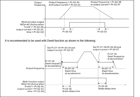 Brake release current (%) and frequency (hz) for the start should be bigger than brake activate current and frequency for the stop. If the setting is the opposite, then current and frequency values of the stop is valid for the start as well.