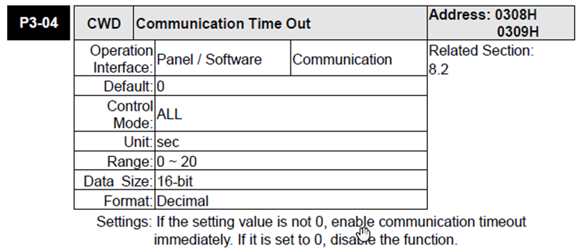 P3-04 is for the RS-232 communication port time-out setting. P3-10 is a parameter to set the time-out value for the RS-485. It may seem reserved in the recent user manuals, which will be updated soon. The unit of the time is the same with P3-04 as seconds.