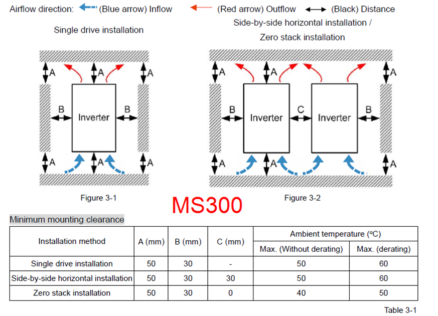 Total air flow rate needs to be considered when making total heat dissipation calculation. If VFDs will be installed with no space in between, then the maximum allowed ambient temperature limit will be lower. If there will be multiple rows of VFDs, a metal plate should be installed between the rows, together with a proper space between the plate and upper and lower row. Please see the related section in user manuals for exact dimensions and calculations. ie. Installation and Mounting for more details.