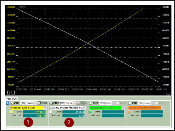 Open the scope and configure the first channel to show “Feedback Pulse (Pulse)” and the second channel to show “Auxiliary encoder feedback (Pulse)”, be sure that channels are configured as 32 bit.