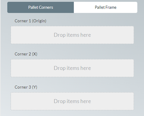 - In palletizing app, depending on which version of the app you are using, you may encounter this tab to set up the 3 corners to set up the pallet frame.